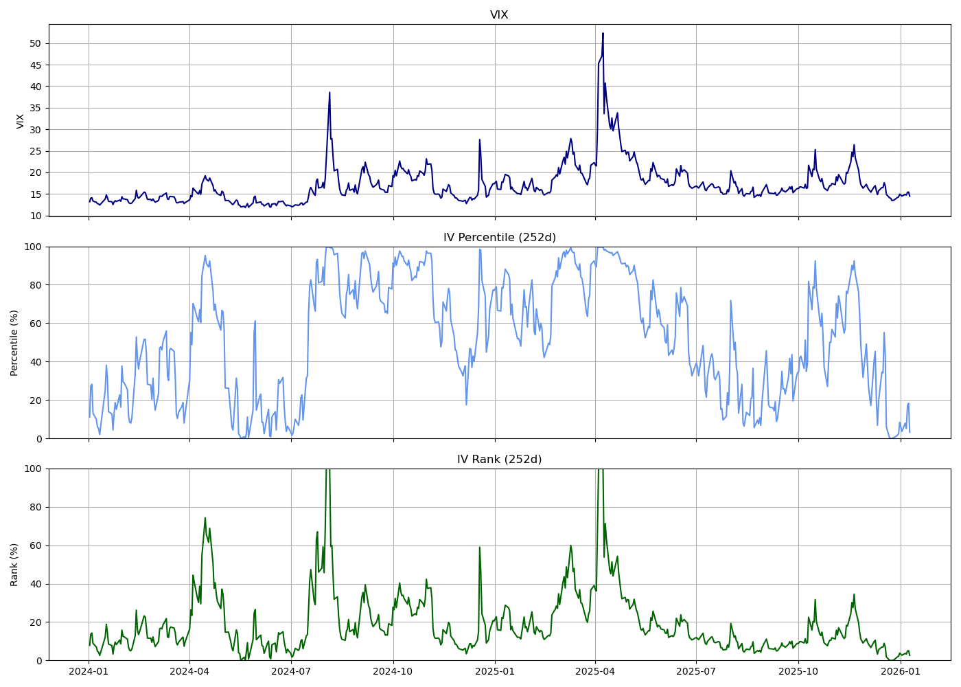 El VIX se mueve en percentiles bajos y el IV Rank confirma el diagnóstico. La volatilidad está barata en términos históricos, pero no está en niveles de complacencia suicida.