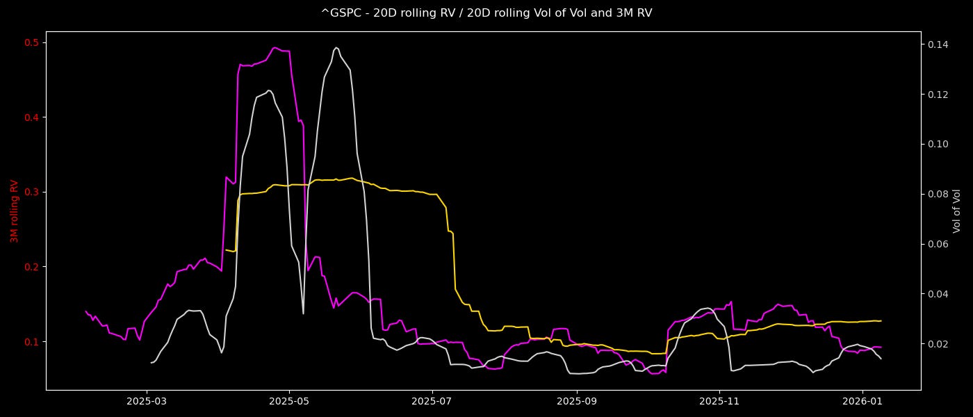 La volatilidad de la volatilidad continúa cayendo. Esto significa algo muy concreto: el mercado no solo se mueve poco, sino que espera que siga moviéndose poco. Las colas se estrechan, los escenarios extremos pierden peso y la distribución de retornos se vuelve más “civilizada”.