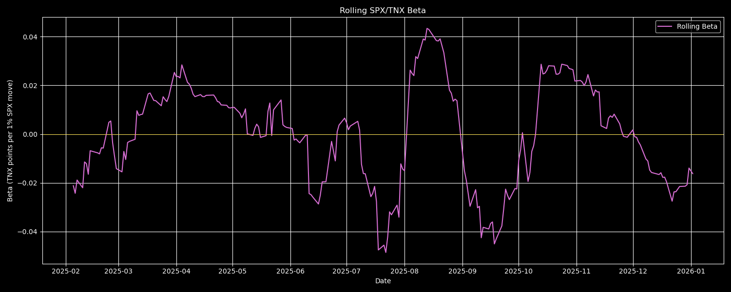 SPX–TNX: beta cercana a cero. Los tipos no están dictando el comportamiento de la renta variable.