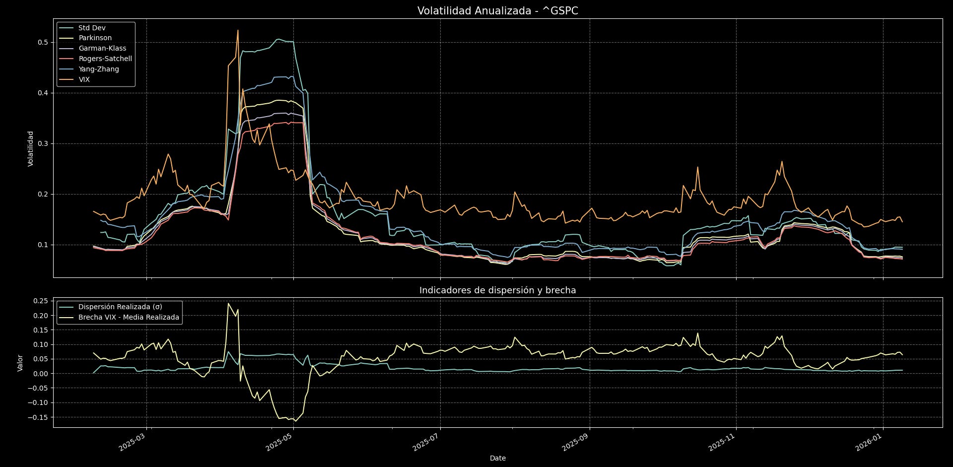 La volatilidad realizada del S&P 500 sigue normalizándose. No hay una sola métrica que contradiga a las demás: todas convergen en niveles bajos y estables. Esto no es casualidad. Cuando distintos métodos de cálculo dicen lo mismo, conviene escuchar.
