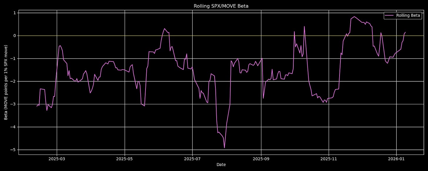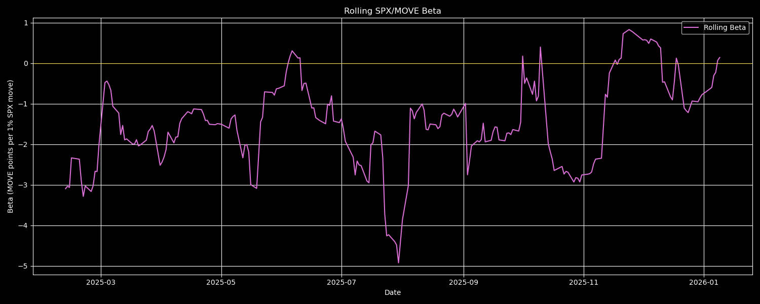 SPX–MOVE: relación negativa, pero contenida. La volatilidad en bonos no se filtra de forma agresiva al equity.