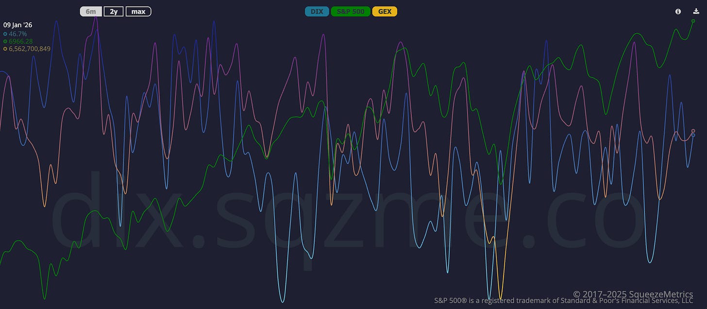 El GEX sigue siendo positivo. Los dealers continúan actuando como estabilizadores del mercado, amortiguando movimientos en lugar de amplificarlos.